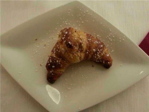刀叉鐺亮,餐盤潔白,挺刮的白色亞麻桌布,經(jīng)濟雖蕭條,該做的不能少。早餐在里面吃,照舊是Cappuccino(卡布奇諾)和Croissant(面包)。