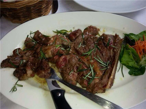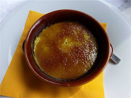 ke沙拉。洋薊,據(jù)說是同巧克力和生蠔齊名的三大催情食物,我同他們分享時,他們完全沒聽過,但是告訴我洋薊清肝排毒,那當然要吃。前車之鑒,這兩天都只要一個主菜,今天他們幫忙點的是水牛肉。甜品,選了他們的有些變化的焦糖燉蛋Creme brulee,變化就是過甜[調皮]。