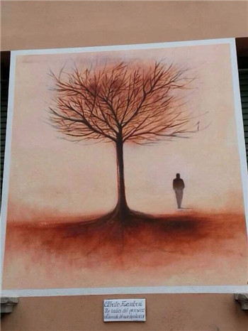羅伯特說這里已經(jīng)舉行了40年的"Muro Dipinto"墻繪藝術節(jié),不少國際知名的藝術家前來,居住在房子里面的主人也樂意。街上游人寥寥,各自安靜欣賞。我走著,想著哪個圓門打開,走出來位身穿筆挺三件套手掛黑色拐杖的鼴鼠先生,看了看懷表后對我們示意問好“Buongiorno"