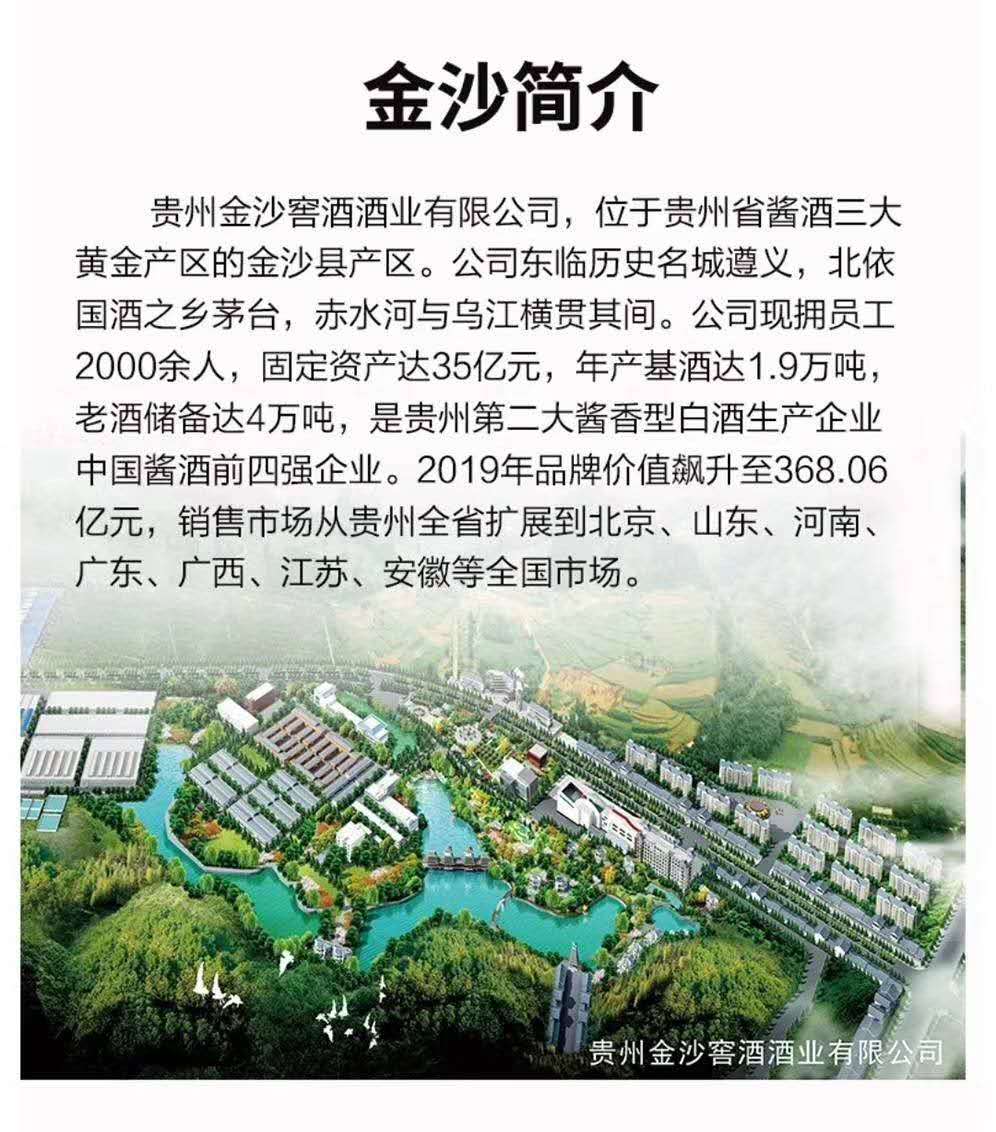 貴州金沙窖酒酒業(yè)有限公司,位于貴州省醬酒三大黃金產(chǎn)區(qū)的金沙縣產(chǎn)區(qū)。公司東臨歷史名城遵義,北依國酒之鄉(xiāng)茅臺,赤水河與烏江橫貫其間。公司現(xiàn)擁員工2000余人,固定資產(chǎn)達35億元,年產(chǎn)基酒達1.9萬噸,老酒儲備達4萬噸,是貴州第二大醬香型白酒生產(chǎn)企業(yè)中國醬酒前四強企業(yè)。201 9年品牌價值飆升至368.06億元,銷售市場從貴州全省擴展到北京、山東、河南、廣東、廣西、江蘇、安徽等全國市場。