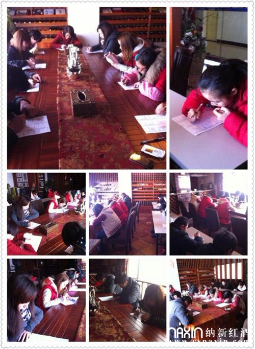 納新紅酒為期五天的專業(yè)知識(shí)培訓(xùn)業(yè)已結(jié)束,正在進(jìn)行理論考試。盲品加理論綜合考試成績(jī)及格者獎(jiǎng)勵(lì)威樂普陳釀干紅一瓶,其中第一名獎(jiǎng)威樂普珍藏干紅一瓶,補(bǔ)考后仍不及格者扣除本月獎(jiǎng)金。有壓力,有激勵(lì),才有學(xué)習(xí)的動(dòng)力!