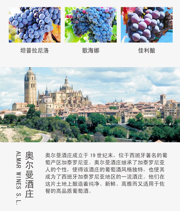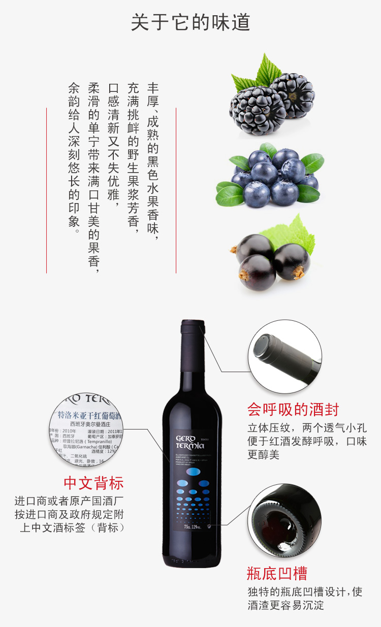 西班牙特洛米亞干紅葡萄酒 ¥ 298.00 此款選用優(yōu)質(zhì)的坦普拉尼洛、歌海娜和佳利釀混合釀制, 酒體呈閃亮的紅寶石色, 豐厚、成熟的黑色水果香味, 具有充滿挑釁的野生果漿芳香, 口感清新又不失優(yōu)雅, 極好的、柔滑的單寧帶來滿口甘美的果香, 余韻給人深刻悠長的印象。 是搭配紅燒肉、牛排、雞、鴨等肉類菜肴及 朋友聚會的最佳飲品。 葡萄年份: 2010年 罐裝日期: 2011年 產(chǎn)地: 西班牙 產(chǎn)區(qū): 加泰羅尼亞 最佳飲用溫度: 16℃--18℃ 原料及輔料: 葡萄汁、二氧化硫 酒精度: 12%vol 葡萄品種: 坦普拉尼洛、歌海娜、佳利釀 貯藏條件: 陰涼、避光、臥放 灌裝商: 奧爾曼酒莊 凈含量: 750ml 產(chǎn)品詳情 產(chǎn)品屬性
