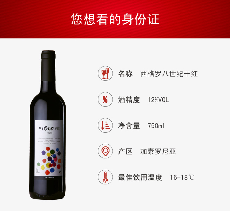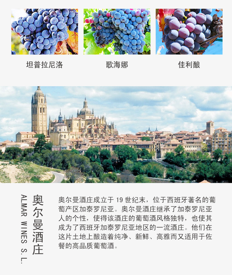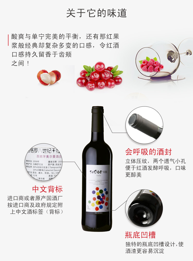 西班牙西格羅八世紀(jì)干紅葡萄酒 ¥ 280.00 此款選用坦普拉尼洛、歌海娜和佳利釀混合釀制, 清澈明亮的酒體,舒爽潔凈的芳香, 酸爽與單寧完美的平衡, 還有那紅果漿般經(jīng)典卻復(fù)雜多變的口感, 令酒感持久留香于齒頰之間, 適合搭配紅燒肉、牛排、雞、鴨等肉類菜肴。 葡萄年份: 2008年 產(chǎn)地: 西班牙 產(chǎn)區(qū): 加泰羅尼亞 最佳飲用溫度: 16℃--18℃ 原料及輔料: 葡萄汁、二氧化硫 酒精度: 12%vol 葡萄品種: 坦普拉尼洛、歌海娜、佳利釀 貯藏條件: 陰涼、避光、臥放 灌裝商: 奧爾曼酒莊 產(chǎn)品詳情 產(chǎn)品屬性