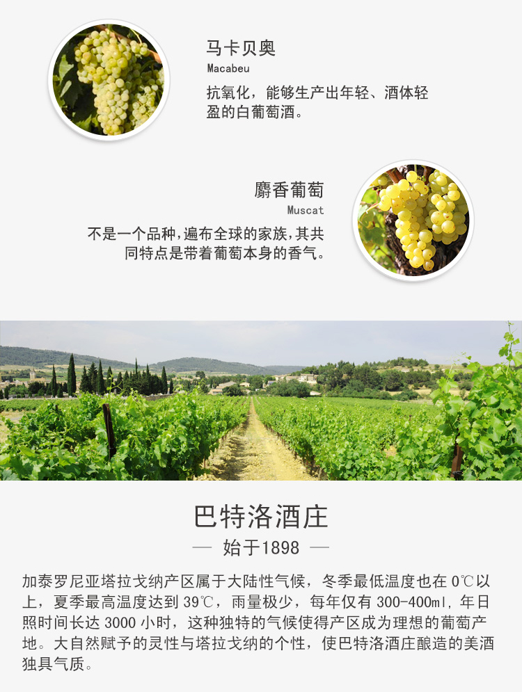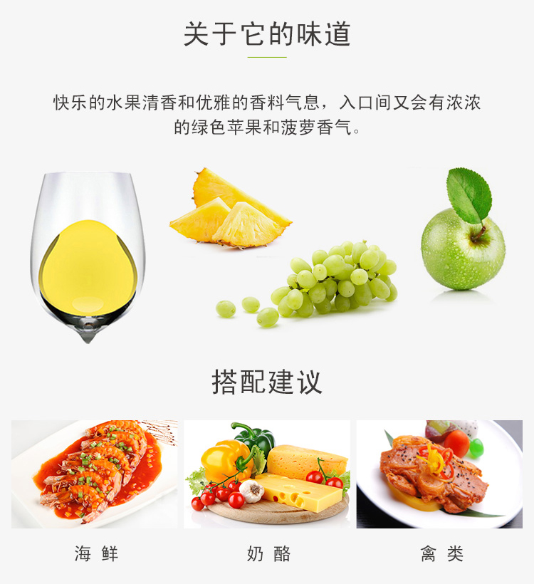 此款精選優(yōu)質(zhì)的馬卡貝奧和麝香葡萄混合釀制, 輝煌的黃色液體中透著絲絲的綠意, 夾著快樂的水果清香和優(yōu)雅的香料氣息, 入口間又會(huì)有濃濃的綠色蘋果和菠蘿香氣, 是搭配海鮮、禽類、奶酪和水產(chǎn)類菜肴及 朋友聚會(huì)的最佳飲品。