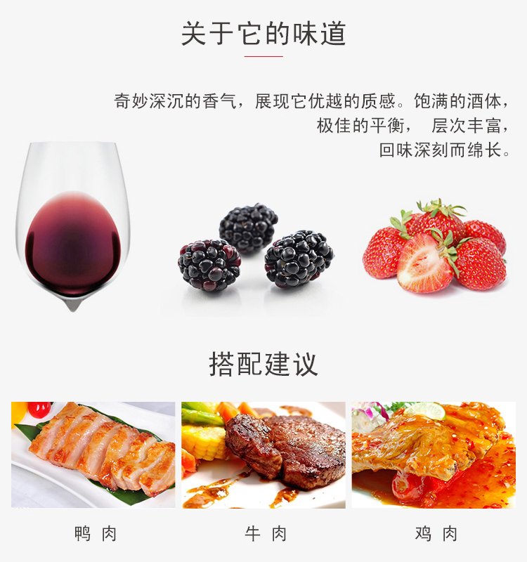 此款選用坦普拉尼洛和歌海娜混合釀制, 具有典型的西班牙風(fēng)格, 明亮奔放的寶石紅色,透出絲絲紫色的光暈。 猶如斗牛士般張揚的性格, 奇妙深沉的香氣,展現(xiàn)它優(yōu)越的質(zhì)感。 飽滿的酒體,極佳的平衡, 層次豐富,回味深刻而綿長。 適合搭配紅燒肉、牛排、雞、鴨等肉類菜肴。