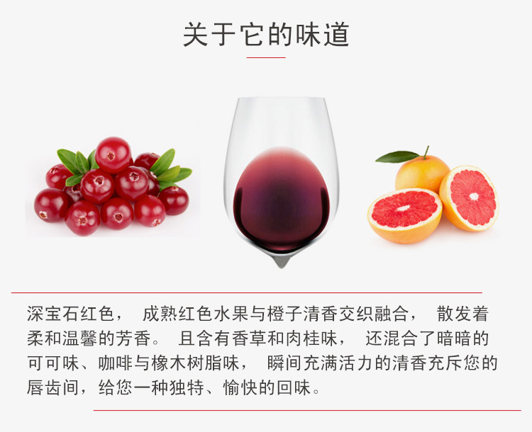 此款采用坦普拉尼洛和歌海娜混合釀制, 呈現(xiàn)誘人的深寶石紅色, 成熟的紅色水果與橙子清香交織融合, 散發(fā)著柔和溫馨的芳香。 且含有香草和肉桂甜嫩的同時, 還混合了暗暗的可可味、咖啡與橡木樹脂味, 瞬間充滿活力的清香充斥您的唇齒間, 給您一種獨特、愉快的回味。 適合搭配紅燒肉、牛排、雞、鴨等肉類菜肴。