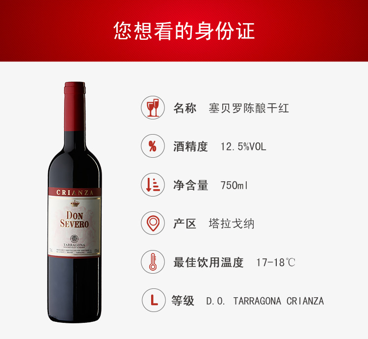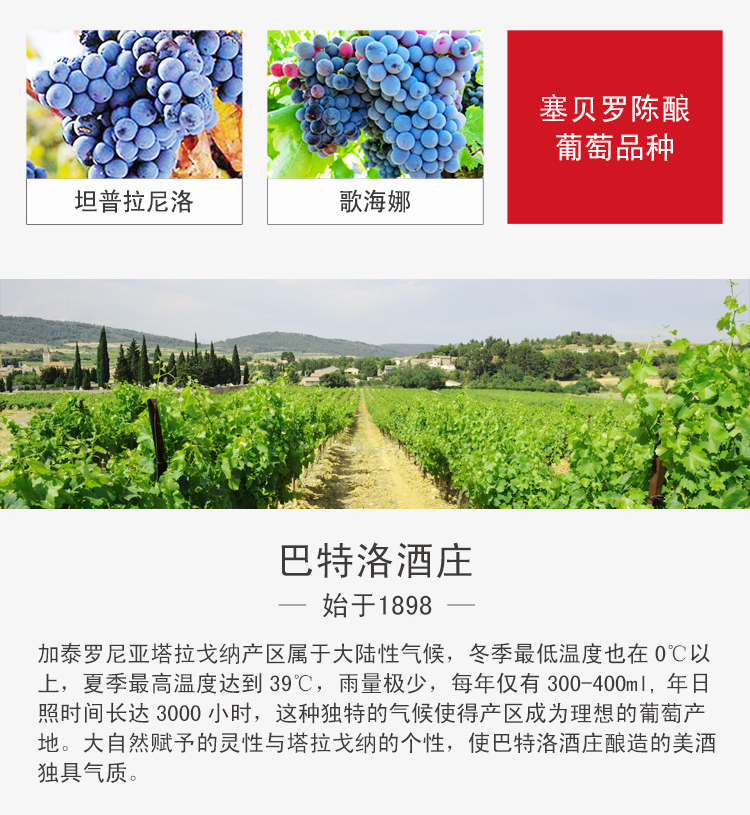 西班牙塞貝羅陳釀DO干紅葡萄酒 ¥ 630.00 此款采用坦普拉尼洛和歌海娜混合釀制, 酒體呈櫻桃紅色, 散發(fā)出成熟的水果香和橡木桶的辛香, 口感絲滑柔順,后味飽含舒暢的柔香。 適合搭配紅燒肉、牛排、雞、鴨等肉類菜肴。 葡萄年份: 2007年 罐裝日期: 2009年6月21日 產(chǎn)地: 西班牙 產(chǎn)區(qū): 塔拉戈納 最佳飲用溫度: 17℃--18℃ 原料及輔料: 葡萄汁、二氧化硫 酒精度: 12.5%vol 葡萄品種: 坦普拉尼洛、歌海娜 等級: 西班牙法定產(chǎn)區(qū)陳釀級(D.O. TARRAGONA CRIANZA) 貯藏條件: 陰涼、避光、臥放 灌裝商: 巴特洛酒莊 凈含量: 750ml 產(chǎn)品詳情 產(chǎn)品屬性