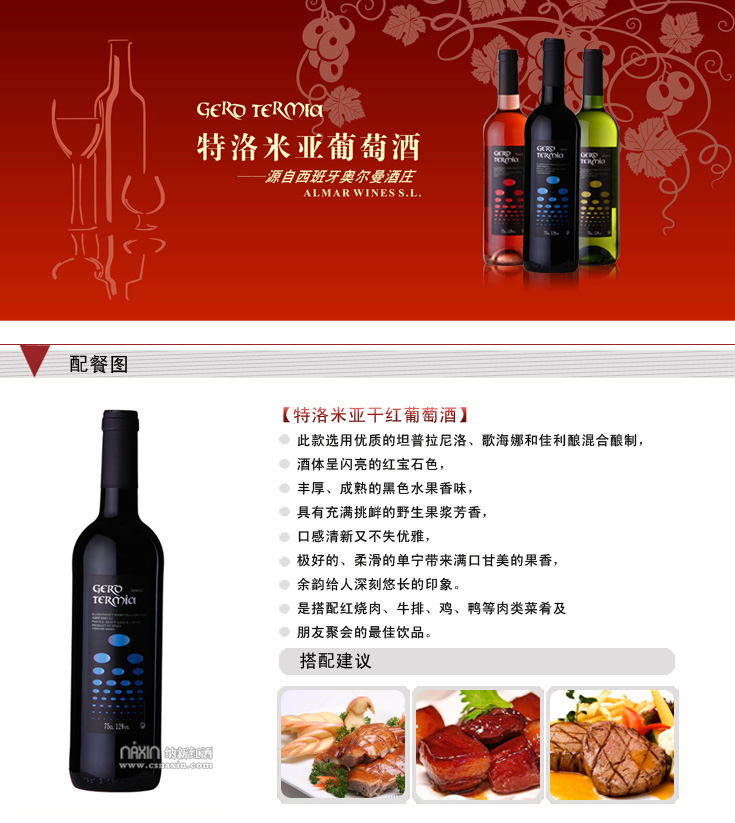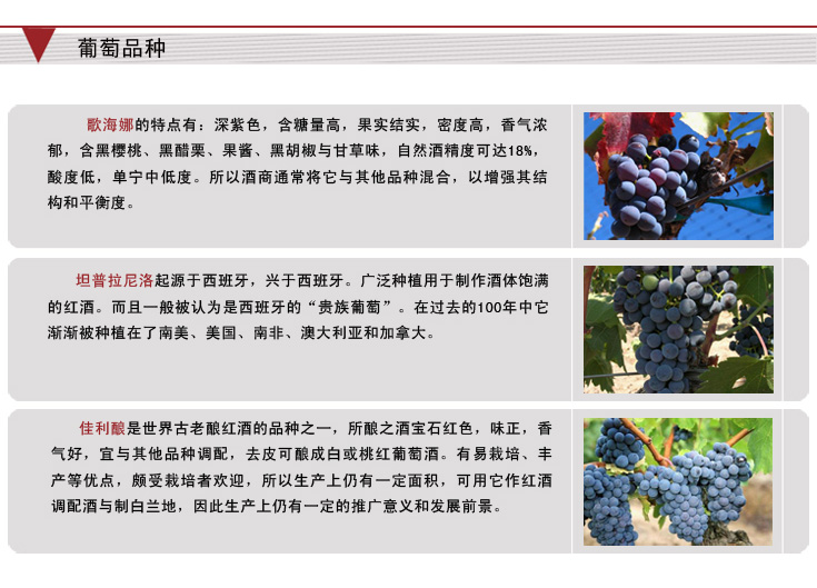 此款選用優(yōu)質(zhì)的坦普拉尼洛、歌海娜和佳利釀混合釀制, 酒體呈閃亮的紅寶石色, 豐厚、成熟的黑色水果香味, 具有充滿挑釁的野生果漿芳香, 口感清新又不失優(yōu)雅, 極好的、柔滑的單寧帶來滿口甘美的果香, 余韻給人深刻悠長的印象。 是搭配紅燒肉、牛排、雞、鴨等肉類菜肴及 朋友聚會(huì)的最佳飲品。