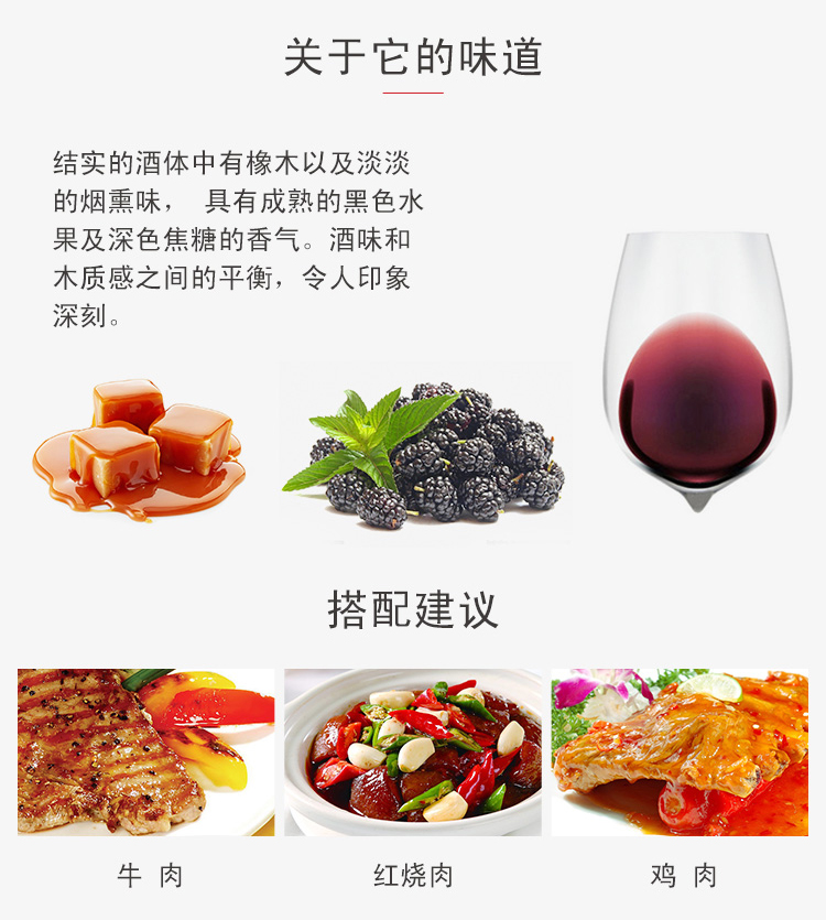 此款采用坦普拉尼洛和赤霞珠混合釀制, 結(jié)實(shí)的酒體中有橡木以及淡淡的煙熏味, 具有成熟的黑色水果及深色焦糖的香氣。 酒味和木質(zhì)感之間的平衡,令人印象深刻。 適合搭配紅燒肉、牛排、雞、鴨等肉類菜肴。