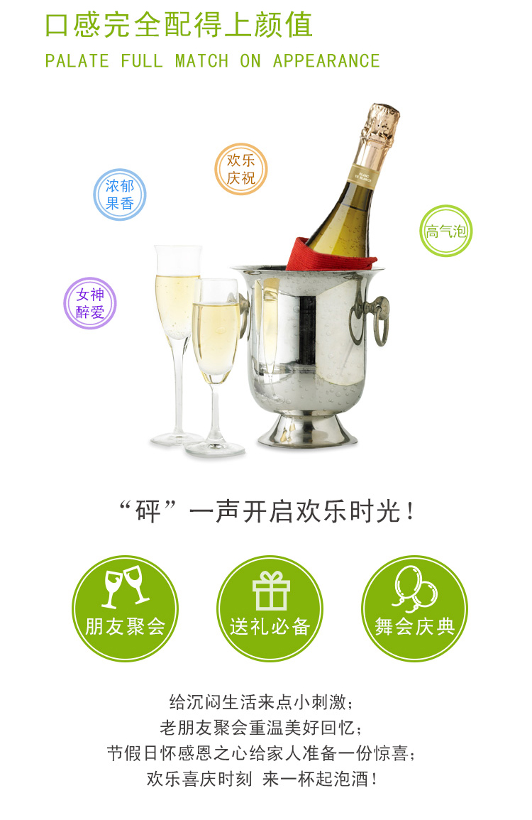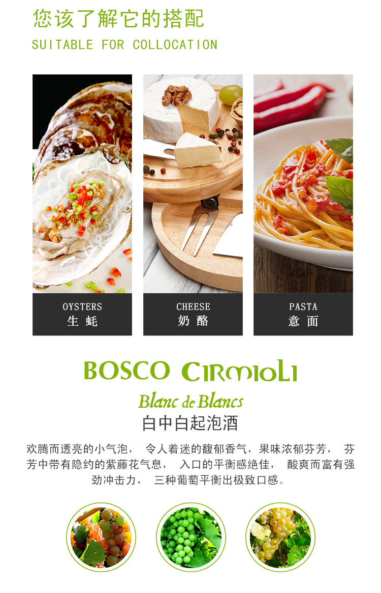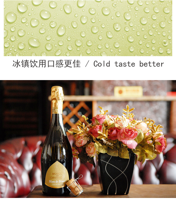 此款選用灰皮諾、霞多麗和格蕾拉混合釀制, 明亮的淺金黃色酒體,歡騰而透亮的小氣泡, 令人著迷的馥郁香氣,果味濃郁芬芳, 芬芳中帶有隱約的紫藤花氣息, 入口的平衡感絕佳, 酸爽而富有強勁沖擊力, 三種葡萄平衡出極致口感, 適合搭配餐前酒、清淡菜式、生蠔、軟奶酪等。