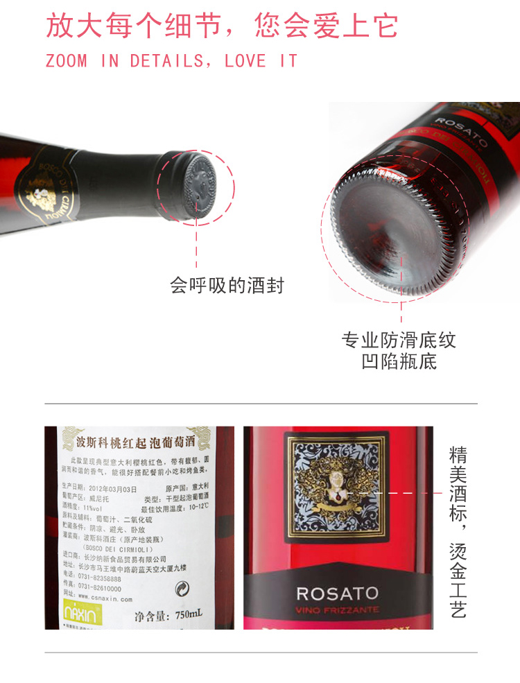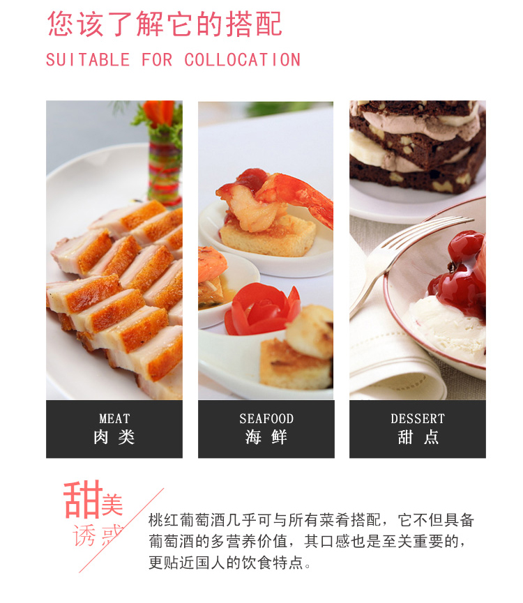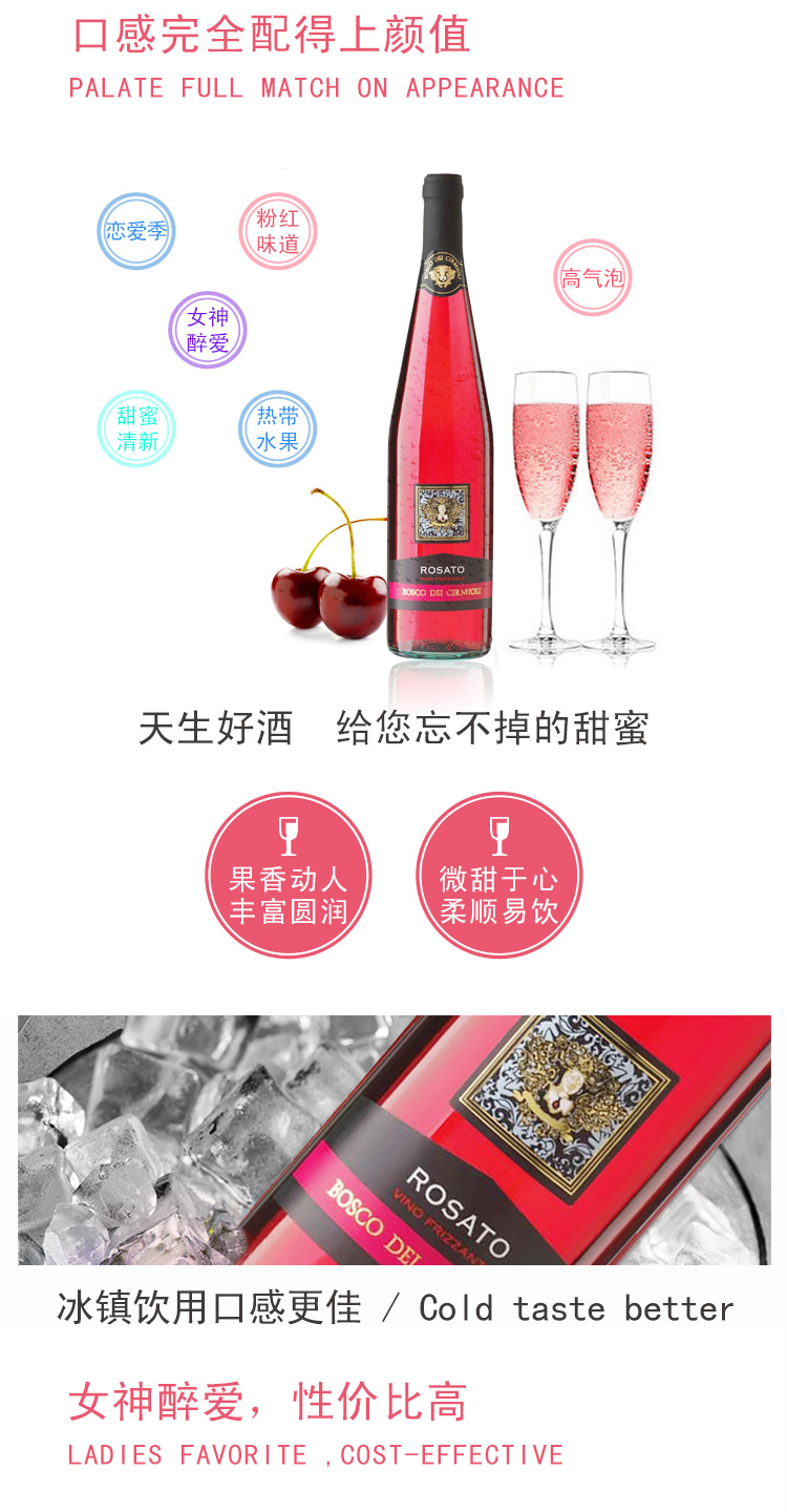 此款選用美樂(lè)和拉波索混合釀制, 呈現(xiàn)誘人的櫻桃紅色, 香氣清新迷人,圓潤(rùn)而和諧, 帶有新鮮紅莓和優(yōu)雅的花香, 口感柔和、酒香濃烈、極易入口, 微甜微澀的入口感, 回味不絕, 是一款個(gè)性十足,精致而又特別的佳釀, 適合搭配意大利面、意式調(diào)味飯、烤魚(yú)和青菜等清淡菜肴。