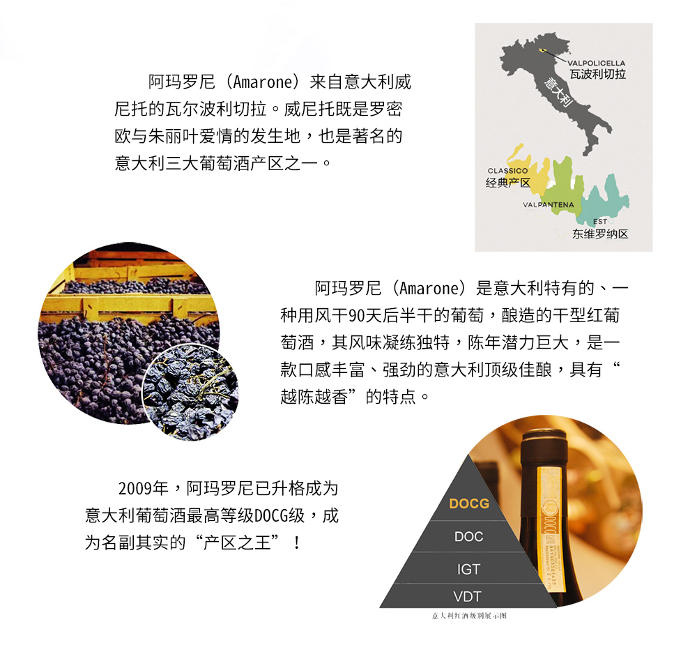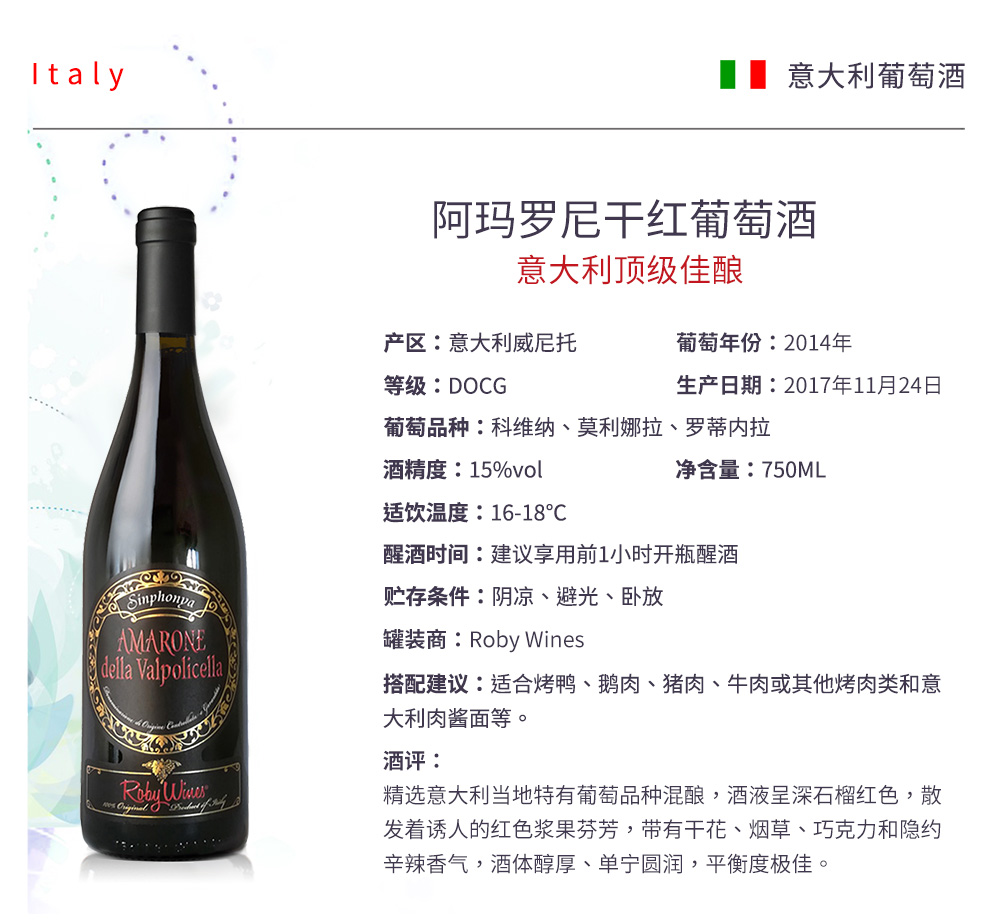 阿瑪羅尼干紅葡萄酒 ¥ 1980.00 葡萄年份: 2014年 罐裝日期: 2017年11月24日 產(chǎn)地: 意大利 產(chǎn)區(qū): 威尼托 最佳飲用溫度: 16℃--18℃ 原料及輔料: 葡萄汁、二氧化硫 酒精度: 15%vol 葡萄品種: 科維納、莫利娜拉、羅蒂內(nèi)拉 等級(jí): DOCG 貯藏條件: 陰涼、避光、臥放 凈含量: 750ml 產(chǎn)品詳情 產(chǎn)品屬性